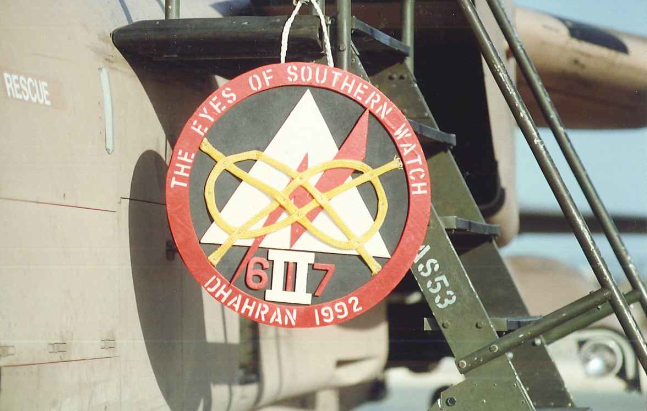 "This was Op Jural a short notice deployment back to Dhahran after the 1st Gulf War to cover Southern Iraq from Saddam's purge in the marshlands where he was deploying heavy artillery. Members of II AC Sqn along with a contingent of 617 from Marham deployed mid-afternoon transiting overnight through Cyprus to land eventually at Dhahran bare base. Given that the jets where already en-route we had but a few hours to prepare to receive them. The initial aim was a show of force to let the Iraqis know we were back. The jets landed, we were ready, those aircraft with faults were quickly made good, weapons loaded and we launched all of them within a couple of hours of arriving in theatre. The ferry pilots were replaced with others who had flown out by civ air. Their side-arms were still in transit so I loaned a dozen desert eagles from the friendly US forces and issued them to the crews. (Note: an eagle does not fit in the standard UK issue holster so I did not ask where the crews put them!) The first picture is of a badge/patch that took me 2 days to make; it took only 1 day for it to get nicked off the wall even though it was nailed on tight. The second picture shows Greg Underhill (SEngO, 617 Sqn) on the far left. The photo records the flight that achieved 1000 operational flying hrs during that deployment.