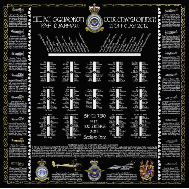 Finally, and deliberately so as I wish this to stick in your mind, Mark Bennison has presented his beautiful hand drawn Commemorative Centenary Dinner Seating Plan to the Squadron � it is a truly amazing piece of work that will take pride of place in the Squadron.